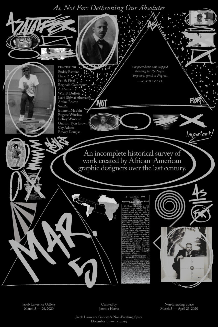 Harris’ research into the exclusion of African-American graphic designers has manifested as an exhibition which is showing at multiple universities and arts organizations throughout 2019. The exhibition, As, For Not: Dethroning Our Absolutes: an incomplete historical survey of work created by African-American graphic designers over the last century, was originally mounted at Maryland Institute College of Art (MICA) and went on to show at RISD.