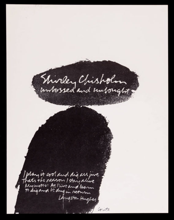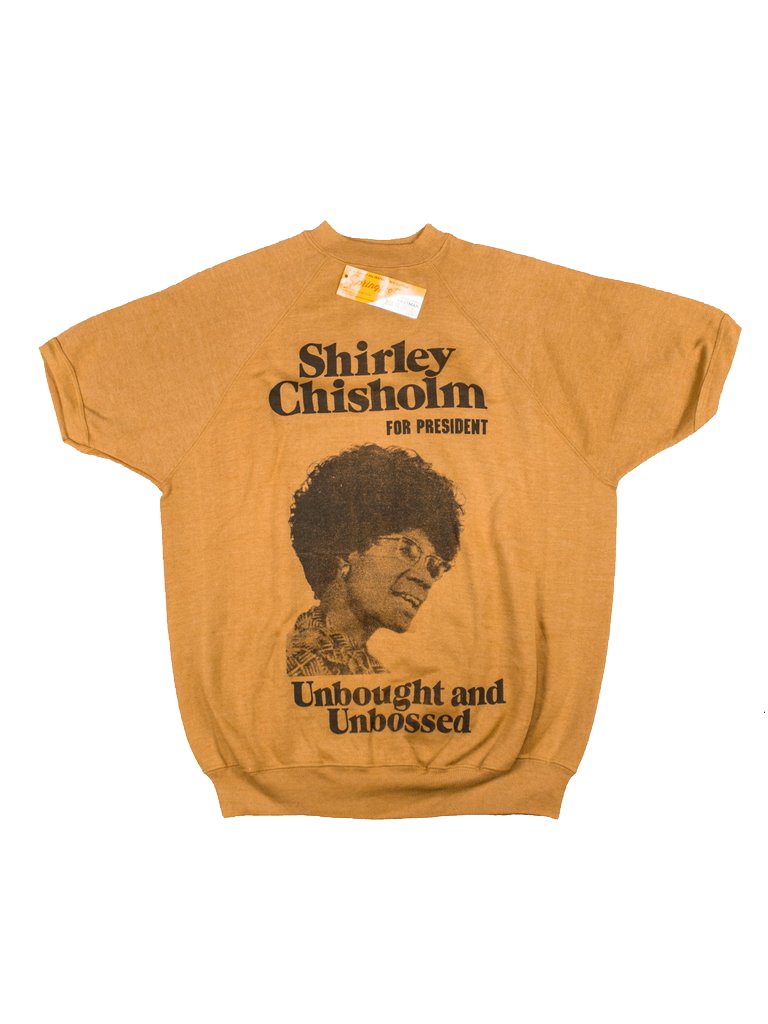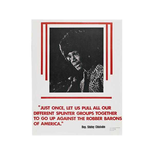 In gathering the accompanying set of visual materials, we were unable to determine credits for all of the designs. During our research we found that during Shirley Chisholm’s seven terms in Congress, she hired an all-female staff, half of whom were Black women. Her campaign was equally as diverse and full of women.